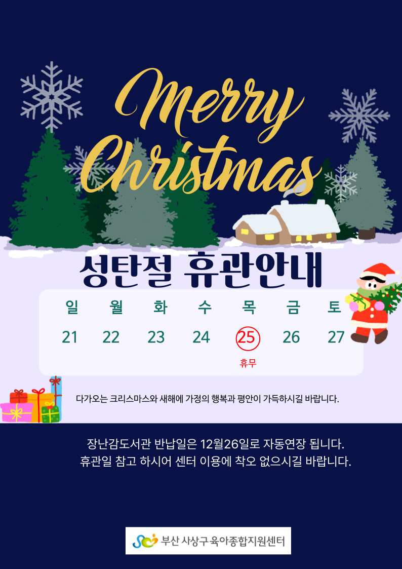 ![]() 12¿ù 25ÀÏÀº °øÈÞÀÏ·Î ¼¾ÅͰ¡ ÈÞ°ü µË´Ï´Ù.