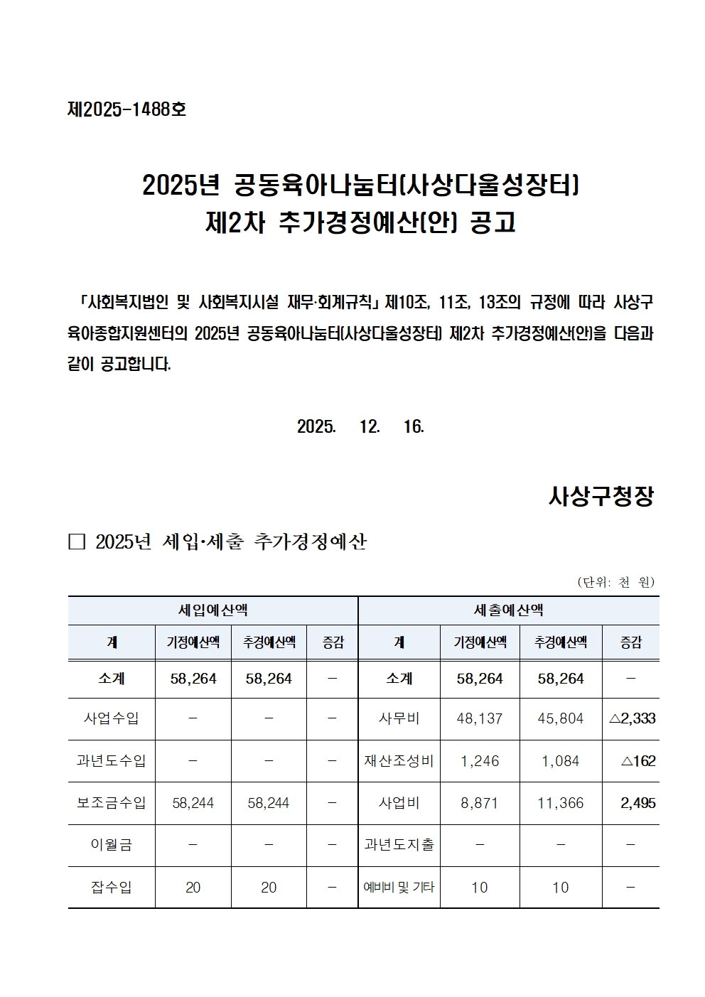 2025³â °øµ¿À°¾Æ³ª´®ÅÍ(»ç»ó´Ù¿ï¼ºÀåÅÍ) Á¦2Â÷ Ãß°¡°æÁ¤¿¹»ê(¾È) °ø°í