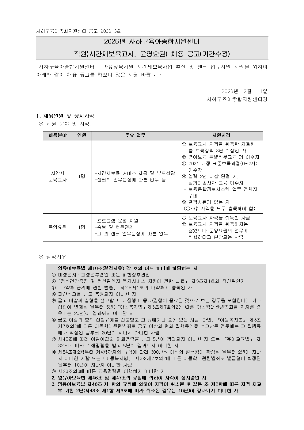2026³â »çÇϱ¸À°¾ÆÁ¾ÇÕÁö¿ø¼¾ÅÍ Á÷¿ø(½Ã°£Á¦º¸À°±³»ç, ¿î¿µ¿ä¿ø) ä¿ë °ø°í(±â°£¼öÁ¤)