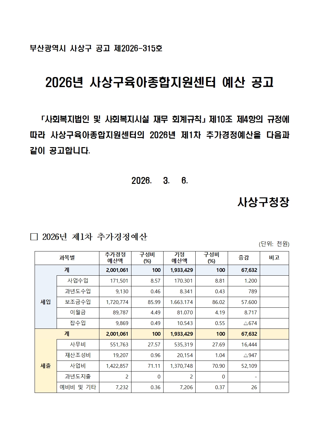 2026³â »ç»ó±¸À°¾ÆÁ¾ÇÕÁö¿ø¼¾ÅÍ ¿¹»ê °ø°í