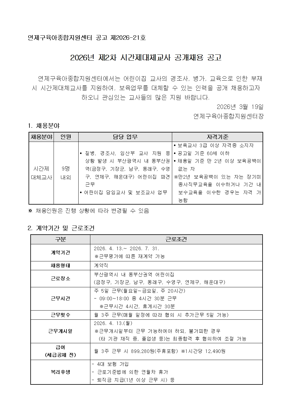 ¿¬Á¦±¸À°¾ÆÁ¾ÇÕÁö¿ø¼¾ÅÍ 2026³â Á¦2Â÷ ½Ã°£Á¦´ëü±³»ç °ø°³Ã¤¿ë °ø°í