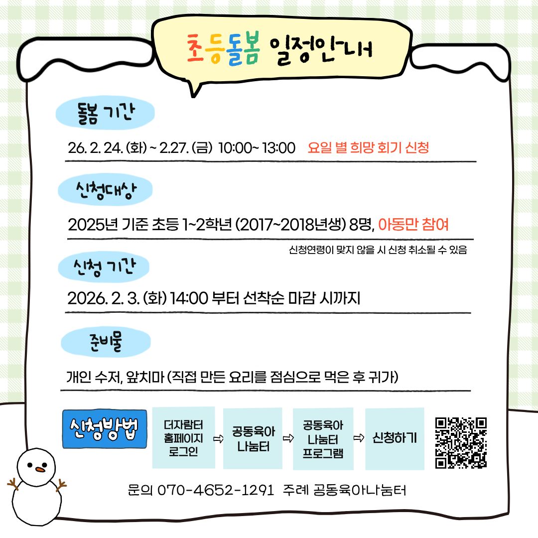 “º½¹æÇÐ ¿ÀÀü, ¾ÆÀÌÀÇ ÇϷ縦 ¾ËÂ÷°Ô ä¿öÁÖ¼¼¿ä” ³î°í·¸¸µé°í·¿ä¸®ÇÏ¸ç ¹è¿ì´Â º½¹æÇÐ ¿ÀÀü Ȱµ¿À» ÁغñÇØº¸¾Ò¾î¿ä. 1. ´ë»ó:(2025³â±âÁØ) - 8~9¼¼ ÀÚ³à 8¸í(2017~2018³â»ý) 2. ÇÁ·Î±×·¥ ÀϽÃ: - 2/24(È)~2/27(±Ý) 10:00~13:00(4Àϰ£) - Èñ¸Á¿äÀÏ °¢ °³º° ½ÅûÇϱâ 3. Áغñ¹°: ¿ä¸®¾ÕÄ¡¸¶, °³ÀμöÀú ÁöÂü 4. ÇÁ·Î±×·¥ ³»¿ë: ¾È³»¹® ÂüÁ¶ (»óȲ°ú Àç·á¼ö±Þ¿¡ µû¶ó ¼ö¾÷³»¿ë°ú ½Ã°£À» ÀϺΠÁ¶Á¤µÉ¼öÀÖÀ½.) 5. ÁøÇà Àå¼Ò: ÁÖ·Ê¿¸°µµ¼°ü4Ãþ °øµ¿À°¾Æ³ª´®ÅÍ 6. ½Åû ±â°£: 2/3(È) ¿ÀÈÄ 14½Ã ~ ¸¶°¨½Ã 7. ½Åû¹æ¹ý: ´õÀÚ¶÷ÅÍȨÆäÀÌÁö(·Î±×ÀÎ ¶Ç´Â ȸ¿ø°¡ÀÔ-°øµ¿À°¾Æ³ª´®ÅÍ-°øµ¿À°¾Æ³ª´®ÅÍ ÇÁ·Î±×·¥ - ÇÁ·Î±×·¥ ¸í È®ÀÎ ÈÄ Èñ¸Á¿äÀÏ ½Åû) * Âü¿© È®Á¤ ¾È³»´Â 2¿ù 14ÀÏ(Åä)À̳»·Î È®Á¤¹®Àڵ帱¿¹Á¤ÀÔ´Ï´Ù. - ¹®ÀÇ: 📞070-4652-1291 |