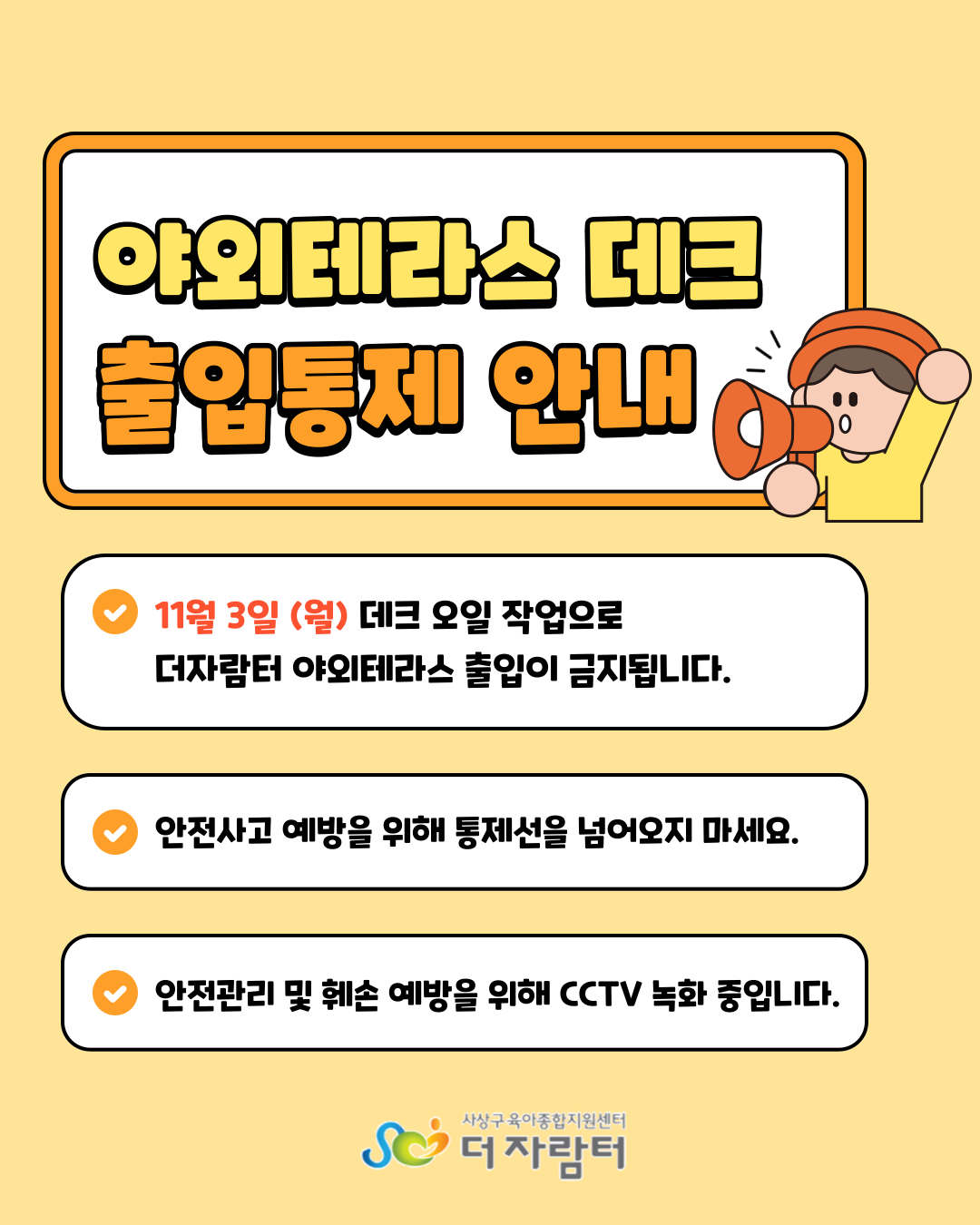 "11¿ù 3ÀÏ ¿ù¿äÀÏ(ÈÞ°üÀÏ)"¿¡´Â ´õÀÚ¶÷ÅÍ ¾ß¿ÜÅ×¶ó½º µ¥Å© ¿ÀÀÏÀÛ¾÷ÀÌ ÁøÇàµË´Ï´Ù. ¾ÈÀü»ç°í ¿¹¹æÀ» À§ÇØ ¡Ú¾ß¿Üµ¥Å© ÃâÀÔÀÌ ±ÝÁö¡Ú µÇ¿À´Ï ¾çÇØ ºÎʵ右´Ï´Ù. #´õÀÚ¶÷ÅÍ #»ç»ó±¸À°¾ÆÁ¾ÇÕÁö¿ø¼¾ÅÍ #»ç»ó±¸À°¾ÆÁ¾ÇÕÁö¿ø¼¾ÅÍÁÖ·Ê2ºÐ¼Ò |