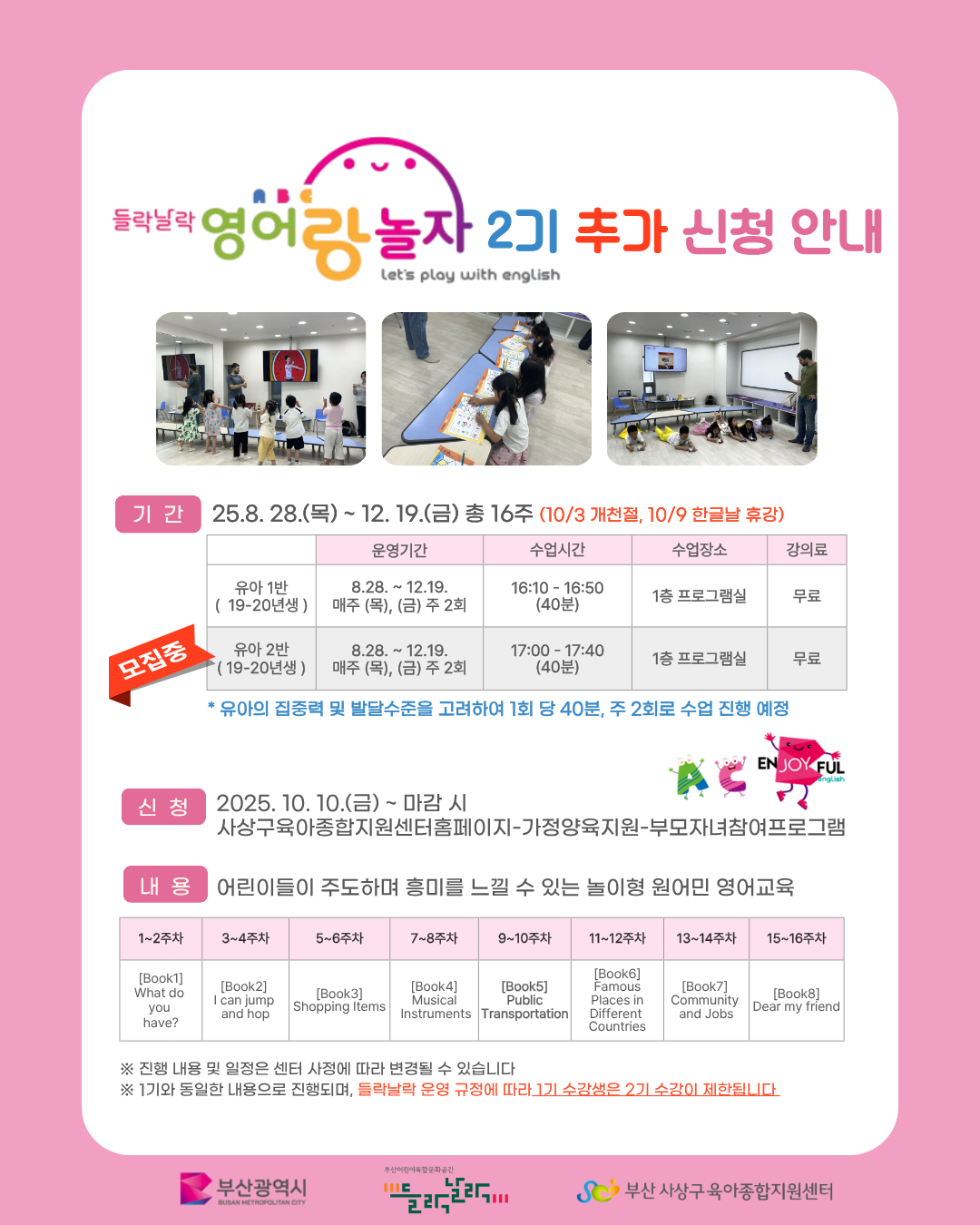 | ±âŸ»çÇ× | [µé¶ô³¯¶ô] ¿µ¾î¶û ³îÀÚ 2¹Ý Ãß°¡¸ðÁý (19,20³â»ý À¯¾Æ) | ||