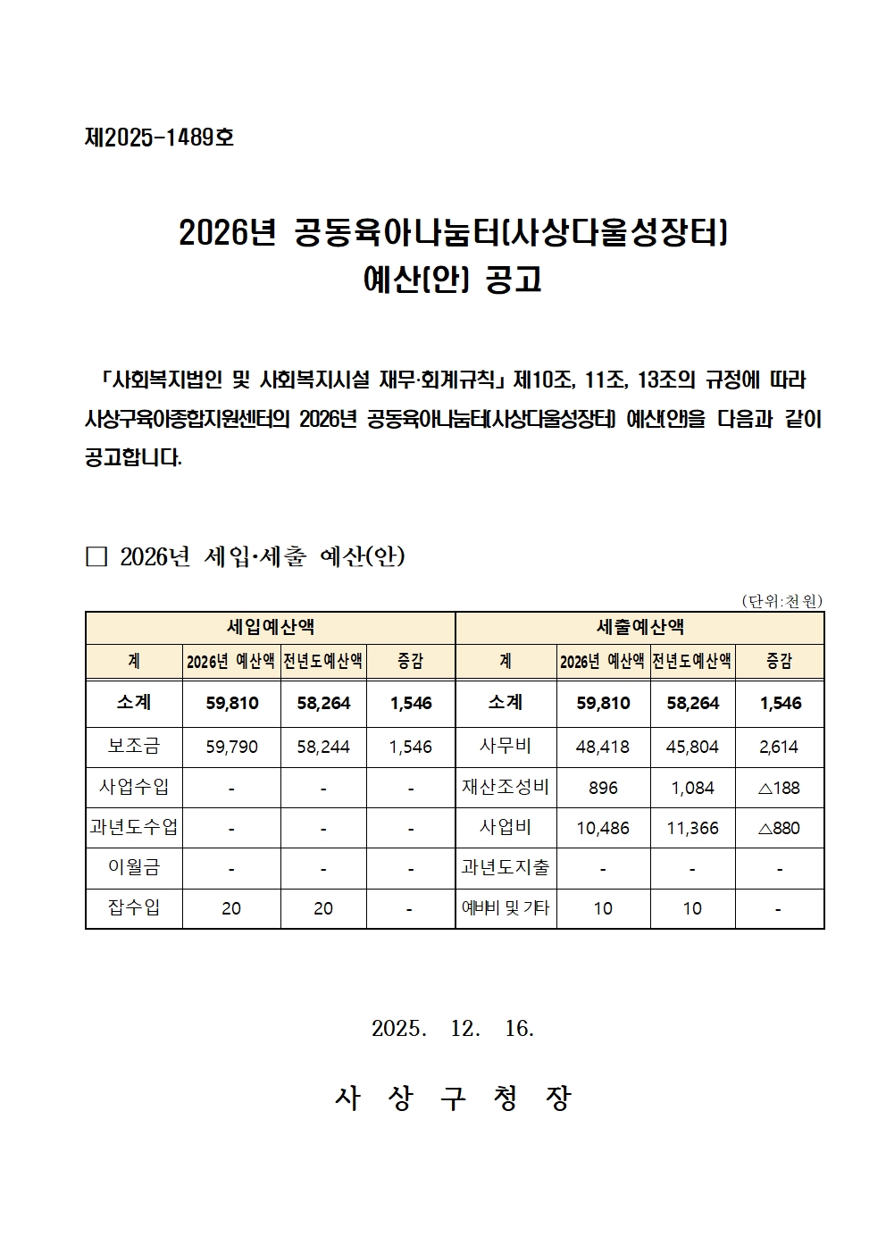 2026³â °øµ¿À°¾Æ³ª´®ÅÍ(»ç»ó´Ù¿ï¼ºÀåÅÍ) ¿¹»ê(¾È) °ø°í
