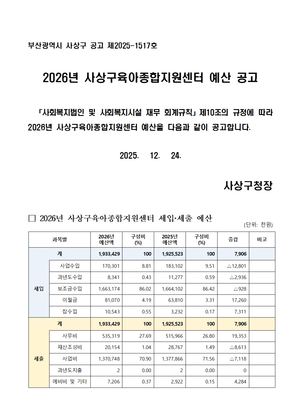 2026³â »ç»ó±¸À°¾ÆÁ¾ÇÕÁö¿ø¼¾ÅÍ ¿¹»ê °ø°í