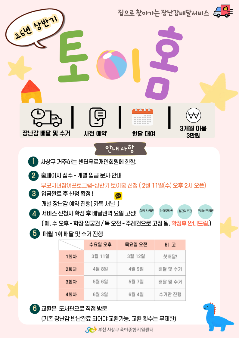 * ½Åû´ë»ó : »ç»ó±¸ °ÅÁÖ ¿µÀ¯¾Æ°¡Á¤ 22°¡Á¤ (¼¾ÅÍÀ¯·áȸ¿ø¿¡ ÇÑÇÔ) * ½Åû±Ý¾× : 30,000¿ø (3°³¿ù) * ½Åû±â°£ : 26.02.11.(¼ö) 14:00 ~ ¼±Âø¼ø ¸¶°¨ ½Ã±îÁö ¡ÙÅäÀÌȨ ¾È³» »çÇ× ¡Ù 1. »ç»ó±¸ °ÅÁÖ - ¼¾ÅÍ °³ÀÎ À¯·áȸ¿ø¿¡ ÇÑÇÔ. 2. ÅäÀÌȨ ÀÌ¿ëÀÚ È®Á¤ÈÄ ¹è´Þ ±Ç¿ª ÁöÁ¤µÇ°í ¹è´Þ ¿äÀÏÀÌ ±Ç¿ªº°·Î °íÁ¤ . ¿¹) ¾ö±ÃÇÐÀåÁַʱǿª - ¼ö¿äÀÏ ¿ÀÈÄ °íÁ¤ / ±¥¹ý´öÆ÷¸ð¶ó±Ç - ¸ñ¿äÀÏ ¿ÀÀü °íÁ¤ *ÀÌ¿ëÀÚ È®Á¤ ÀÌÈÄ ¹è´Þ ¿äÀÏ °íÁ¤µÇ¸ç Â÷ÈÄ º¯°æ µÉ ¼öµµ ÀÖÀ½. ¡ÚÅäÀÌȨ ½Åû/ÀÌ¿ë¹æ¹ý¡Ú 1. [¼¾ÅÍ È¨ÆäÀÌÁö - °¡Á¤¾çÀ°Áö¿ø - ºÎ¸ð/ÀÚ³àÂü¿©ÇÁ·Î±×·¥ - ÇÁ·Î±×·¥½ÅûÇϱâ - 2026³â »ó¹Ý±â ÅäÀÌȨ ȸ¿ø ¸ðÁý] *ȨÆäÀÌÁö Á¢¼ö ±â°£ : 26.2.11.(¼ö) ¿ÀÈÄ 2½ÃºÎÅÍ ¼±Âø¼ø 22°¡Á¤ 2. ÅäÀÌȨ ½Åû Á¢¼ö ¿Ï·á ÈÄ ¾È³»¹®ÀÚ ¹ß¼Û