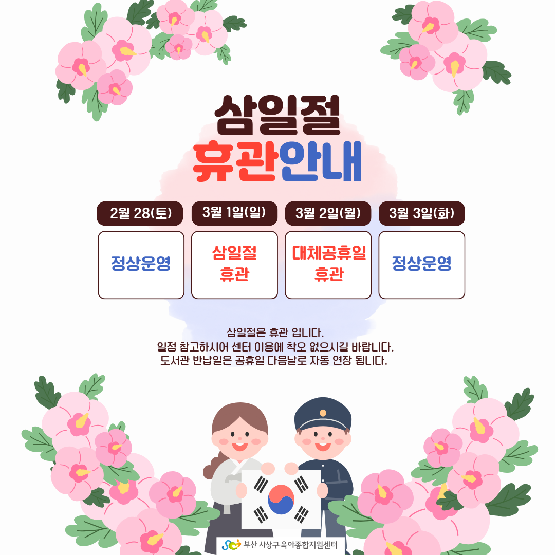 ![]() [ÈÞ°ü¾È³»] »ïÀÏÀýÀº ¹ýÁ¤ °øÈÞÀÏ·Î ¼¾ÅÍ Àüü°¡ ÈÞ°ü µË´Ï´Ù.