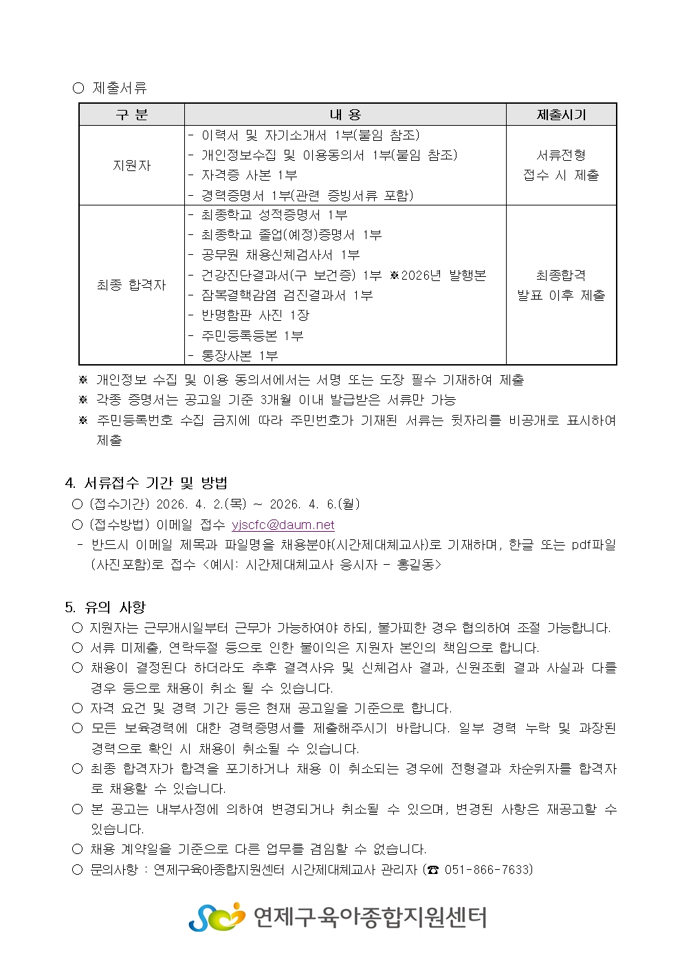 [¿¬Á¦±¸À°¾ÆÁ¾ÇÕÁö¿ø¼¾ÅÍ]2026³â Á¦2Â÷ ½Ã°£Á¦´ëü±³»ç °ø°³Ã¤¿ë Àç°ø°í