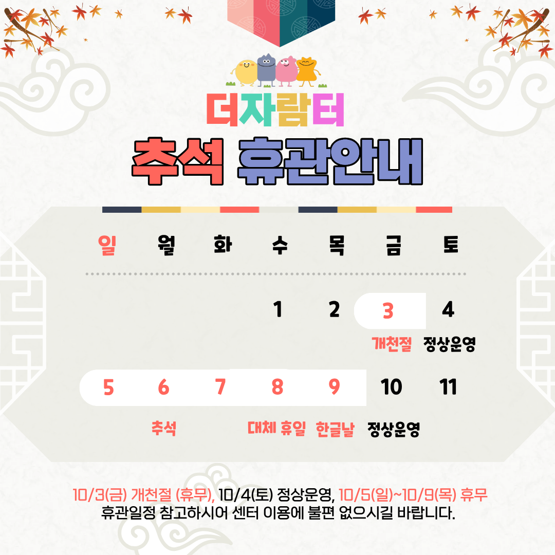 ¾È³çÇϼ¼¿ä. ´õÀÚ¶÷ÅÍ ÀÔ´Ï´Ù ~ Ãß¼® ´õÀÚ¶÷ÅÍ ÈÞ°üÀÏÁ¤ ¾È³»µå¸³´Ï´Ù ! 📌10/3(±Ý), 10/5(ÀÏ) ~ 10/9(¸ñ): °øÈÞÀÏ ÈÞ°ü 📌10/4(Åä), 10/10(±Ý): ´õÀÚ¶÷ÅÍ Á¤»ó¿î¿µ ÀÏÁ¤À» Âü°íÇϼż À̿뿡 Âø¿À°¡ ¾øÀ¸½Ã±æ ¹Ù¶ø´Ï´Ù ~ |