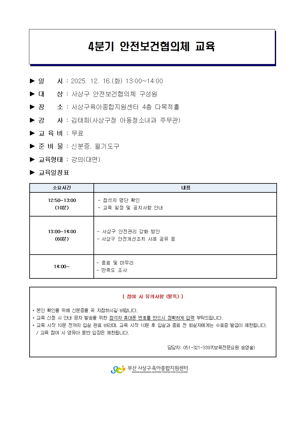 | 2025³â 4ºÐ±â ¾ÈÀüº¸°ÇÇùÀÇü ±³À°(¾ÈÀü°ü¸® °È ¹æ¾È ¹× ¾ÈÀü°³¼±Á¶Ä¡ °øÀ¯) | |||