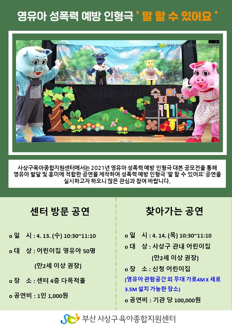 | °ø¿¬ [ã¾Æ°¡´Â °ø¿¬] 4¿ù ¼ºÆø·Â ¿¹¹æ ÀÎÇü±Ø ¸» ÇÒ ¼ö ÀÖ¾î¿ä | |||